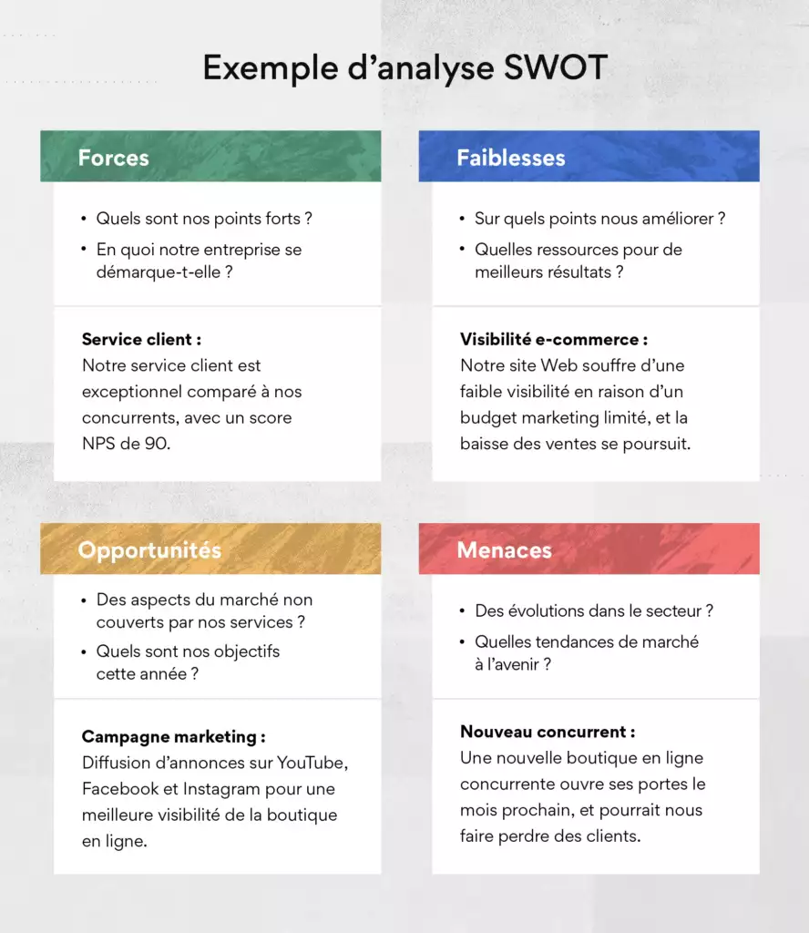 L’**analyse SWOT** (Forces, Faiblesses, Opportunités, Menaces) permet d’évaluer la position actuelle de l’entreprise et de définir une stratégie de positionnement en fonction de ses atouts et des conditions du marché.